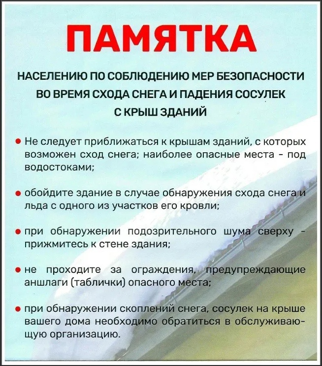 В целях обеспечении безопасности людей в зимне-весенний период руководителям организаций независимо от форм собственности, расположенных на территории района, рекомендуется своевременно выявлять и удалять снег, сосульки и наледь с крыш зданий.