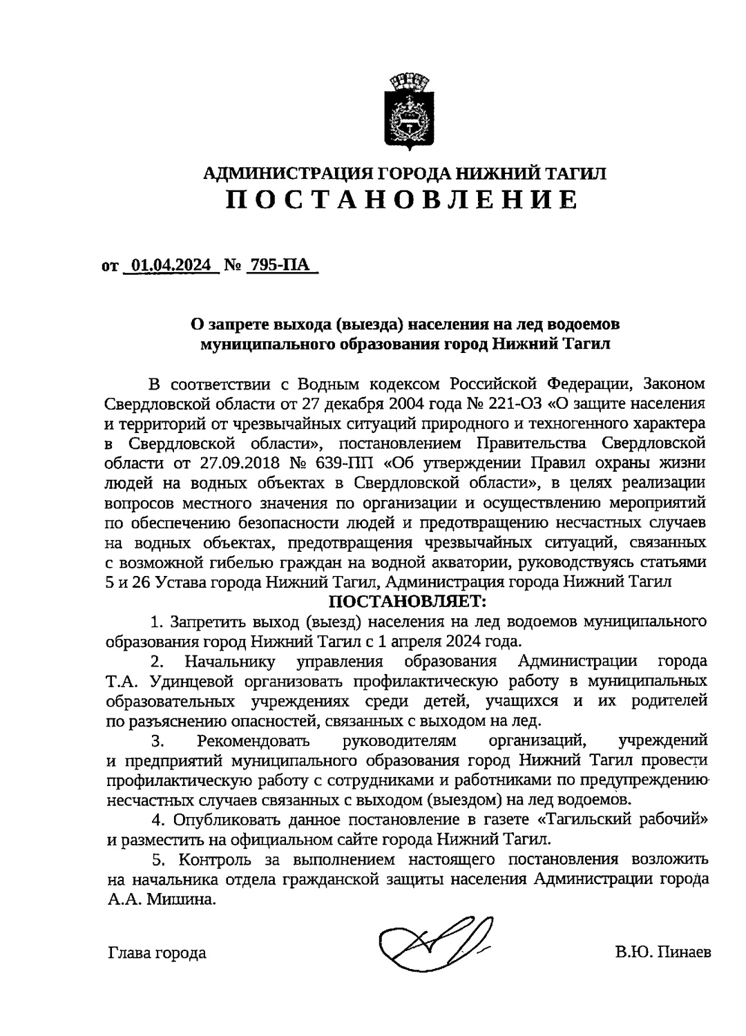 Постановление о запрете выхода (выезда) населения на лёд водоёмов